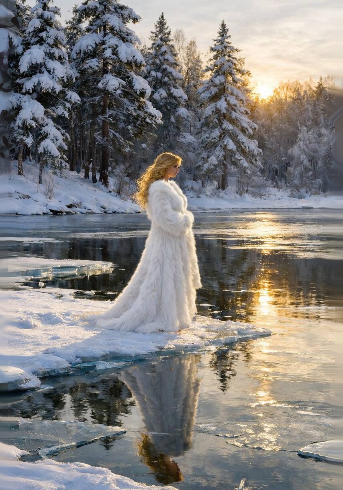 Зимний воздух, тишина леса, озеро во льду и мягкий свет восходящего солнца, который загорается в волосах девушки и вспыхивает золотом на фактуре шубы…